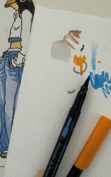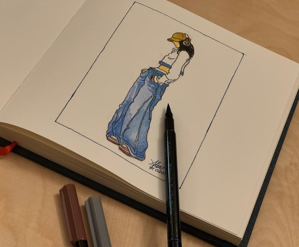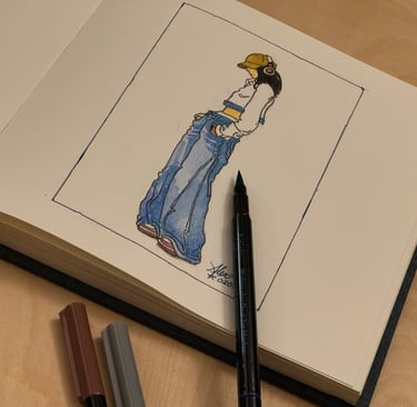 Anyway, here's a drawing of a woman I met. She wore big, baggy pants, a lightweight, cropped cardigan, oversized shoes, and headphones over her cap. It was a refreshing sight, especially baggy pants, which I think have firmly reemerged as cool fashion again. It is a relaxed vibe with a bold fashion aesthetic and matches well with anything light, like simple tops, tailored blouses, or fitted knits. And I think her style was effortlessly cool, a welcome change from all the loungewear I see daily.