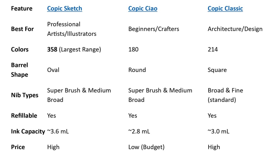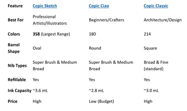 This comparison chart outlines the differences between COPIC® marker sets. Both Copic Sketch and Copic Ciao are easy to use and offer the same quality. However, Copic Sketch provides a wider color range and is slightly more expensive than Ciao.