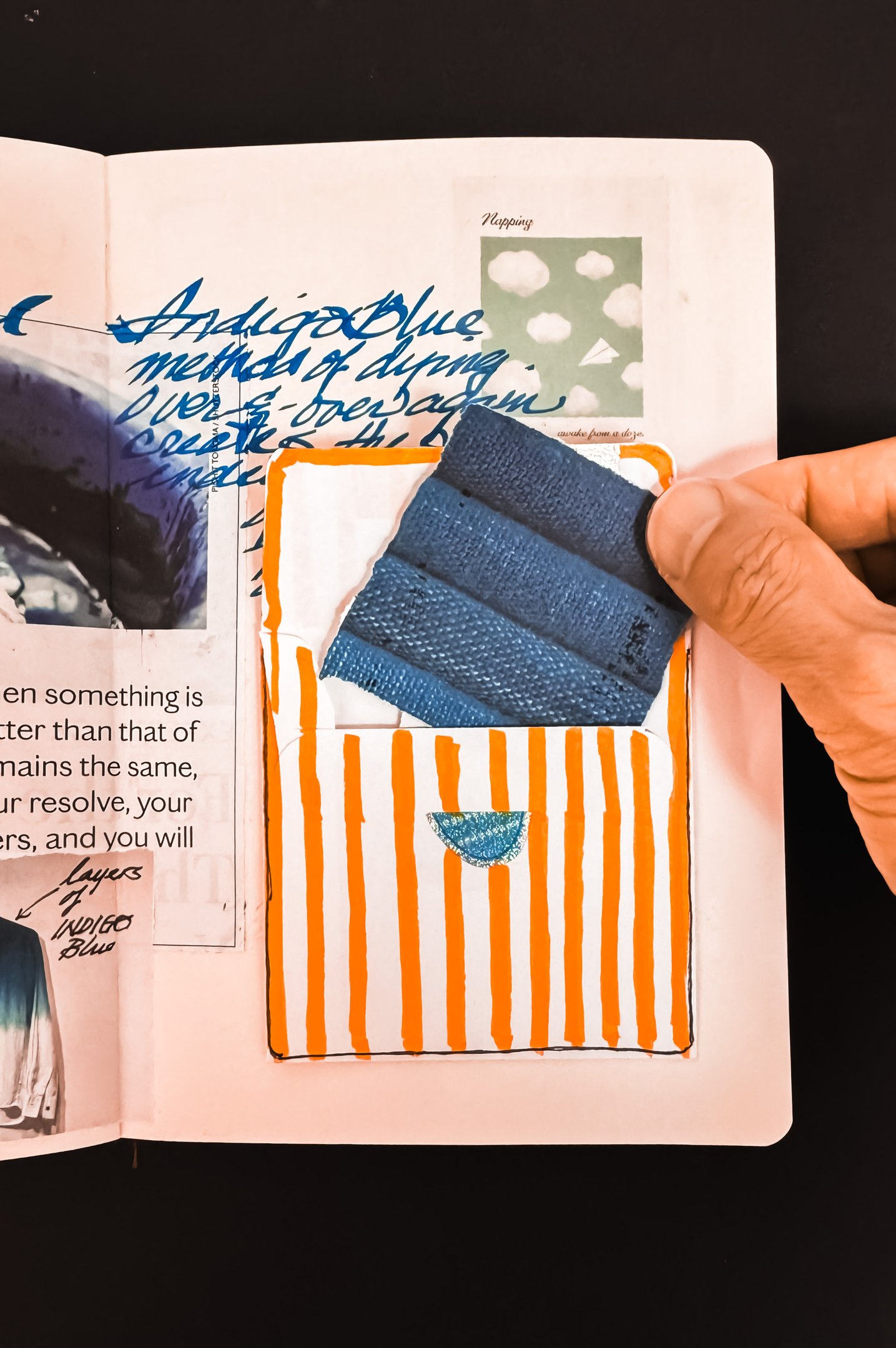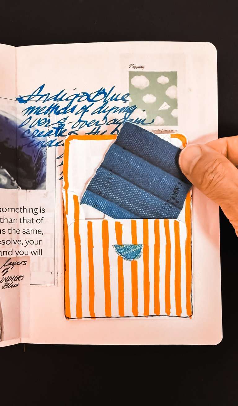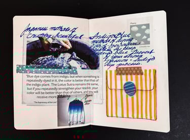 To make the page more interactive and interesting, I added an envelope to hide a cutout image of an old Japanese fabric dyed in Indigo Blue that complement the article.