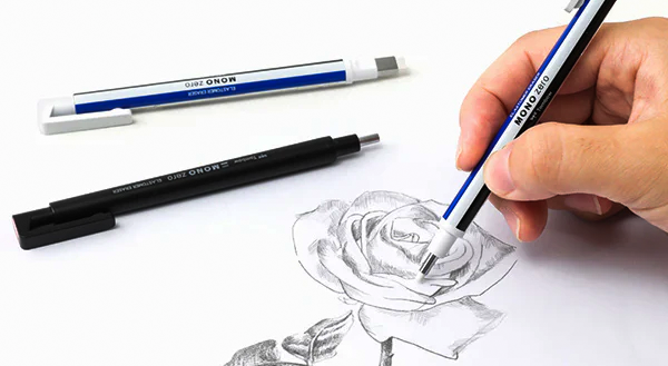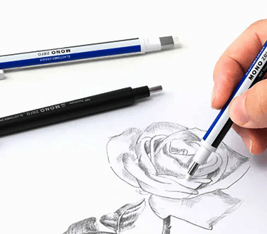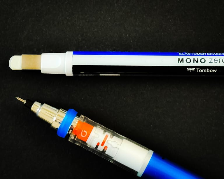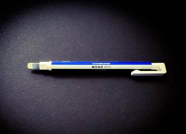 The Tombow Mono Zero thin eraser from Japan is great for detailed work because its ultra-fine tip, pen-like shape, and firm eraser let you erase precisely without affecting nearby areas. I find it essential for fixing a single letter, removing a small smudge in a drawing, adding sharp highlights to artwork, or tidying up architectural plans. Its compact size also fits easily in my slim pencil case, which I keep in my tote bag along with my journal.