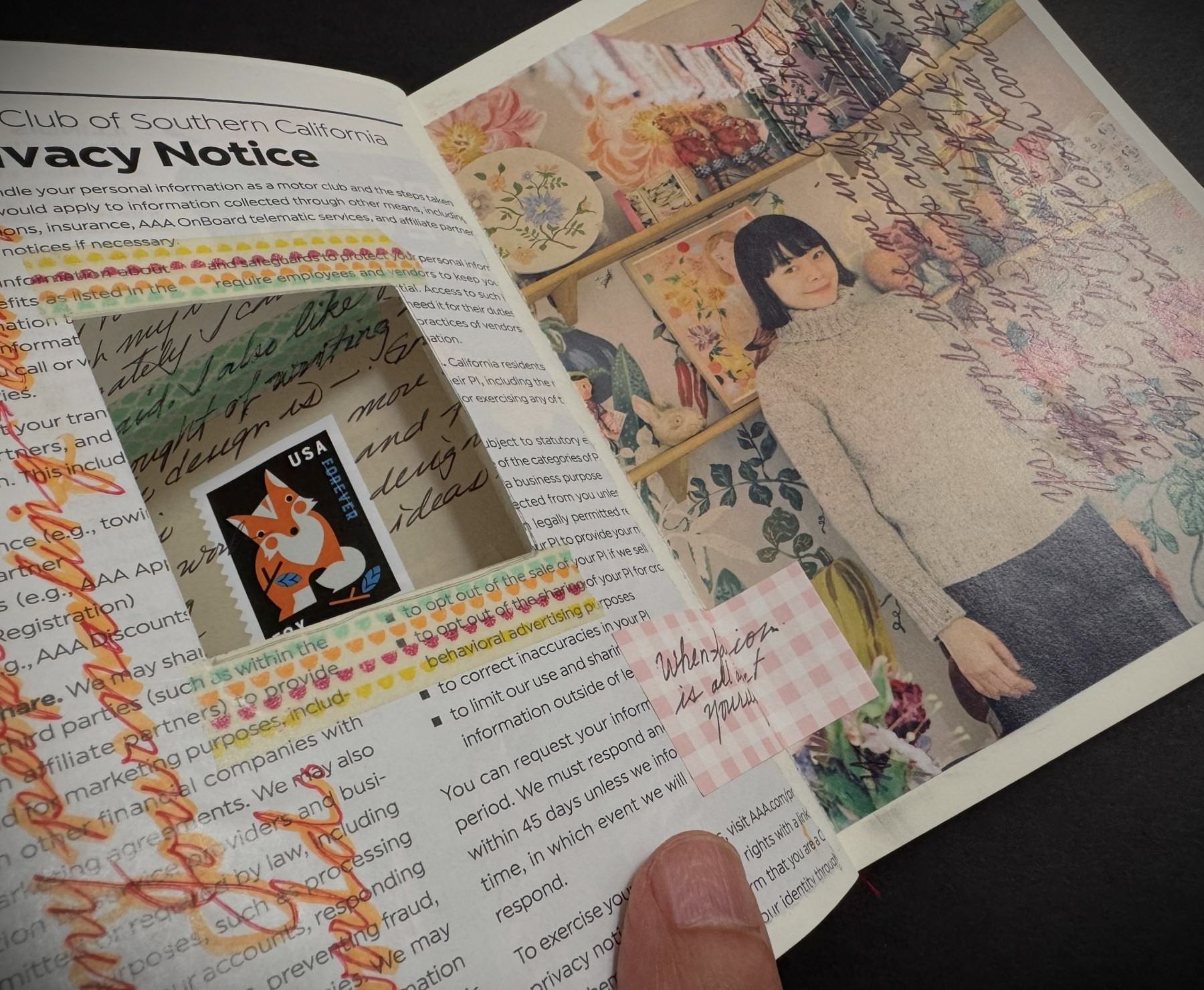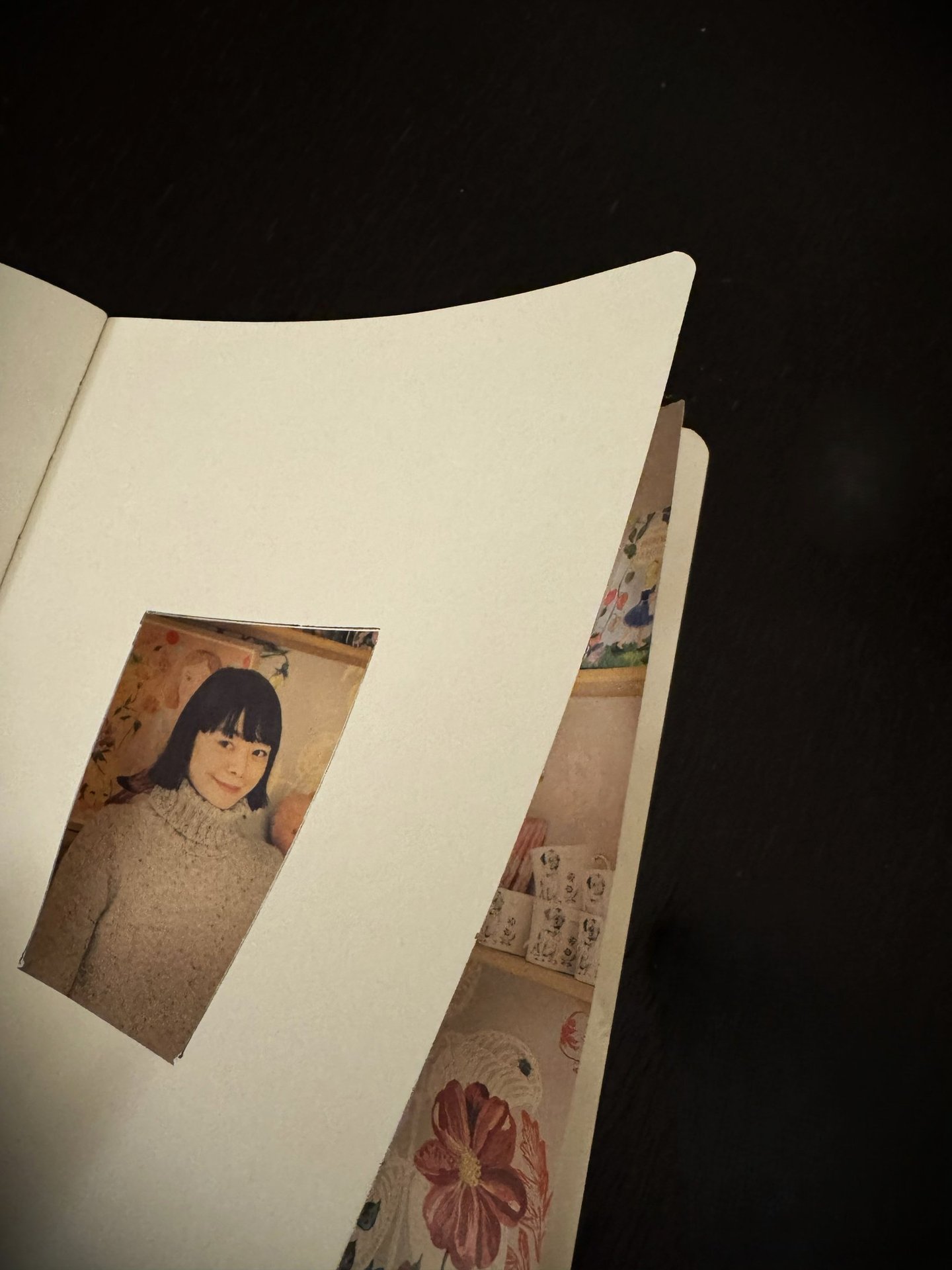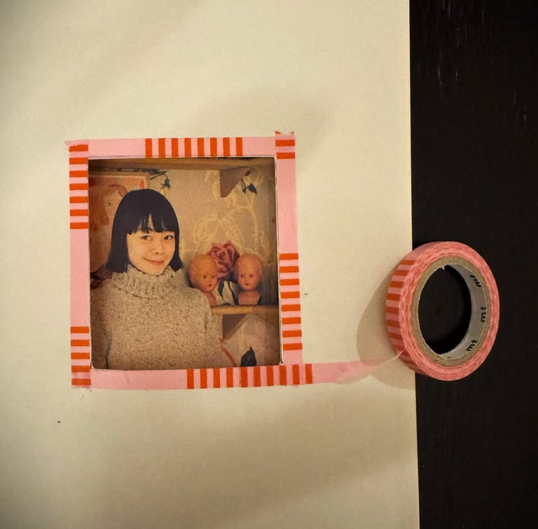 That said, I applied this method by cutting out the center of the pages to create a “window” that reveals part of the next page. I taped around the opening to form a whimsical frame, inviting curiosity and encouraging the reader to turn the page to discover what lies behind the window.