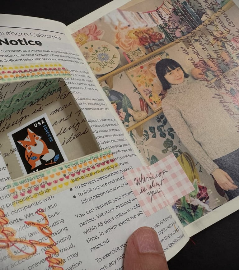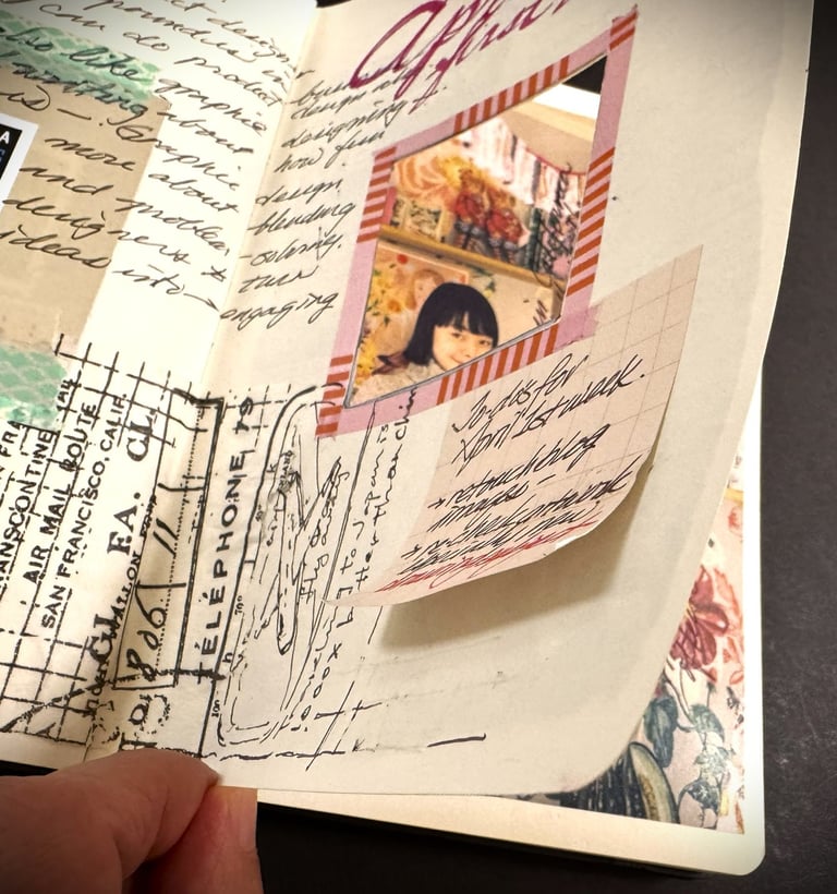 I felt that trimming the page itself is an engaging way to manage and expand the limited space of the journal pages. Trimming enables you to add different materials as an extension of the page, creating a unique expression that reflects your personal style.