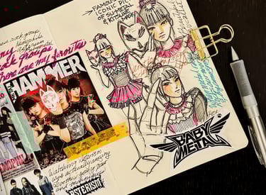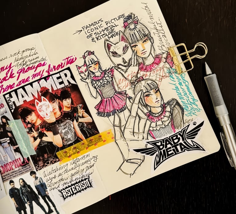 This weekend, I made a collage of my favorite young Japanese rock bands, all of which have had a big impact worldwide. I was inspired by their energy and chose Su-Metal, one of the charismatic vocalists, to sketch. I started with a rough drawing in my journal and finished it on watercolor paper. Su-Metal is the lead singer of BABYMETAL, a group that has changed the metal rock scene with their mix of cute songs and heavy instrumentals, winning fans everywhere.