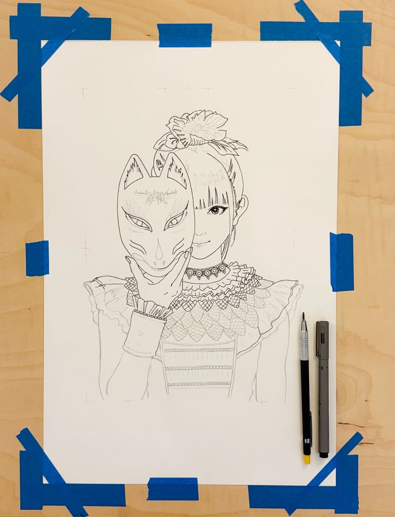I thought Su-Metal, with her famous 'kitsune' fox mask, would be a great subject for my weekend drawing. I wanted to focus on the details that set her apart in music. Her strong presence, the sharp lines of her silhouette, the power in her eyes, and the unique look of the fox mask all come together to create a striking image I wanted to capture.