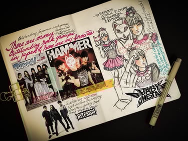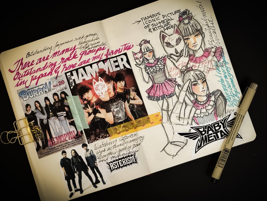 This weekend, I crafted a simple collage of my favorite young Japanese rock metal bands, each of which has sparked a global wave of influence. Inspired by their engaging figures, I picked one of the charismatic vocalists, Su-Metal, and decided to do a rough sketch on the journal page and finalized it on cold-press watercolor paper. Su-Metal is known as a vocalist of the iconic group BABYMETAL, shaping the metal rock scene with their “kawaii” (cute) songs and brutal instrumentals, winning hearts worldwide.