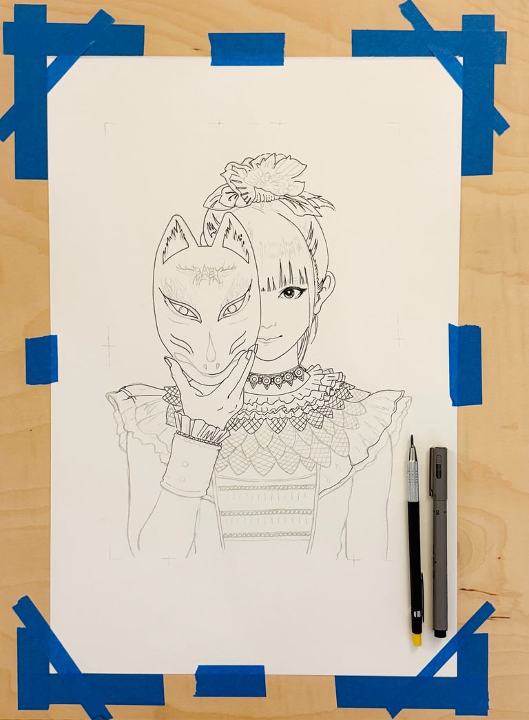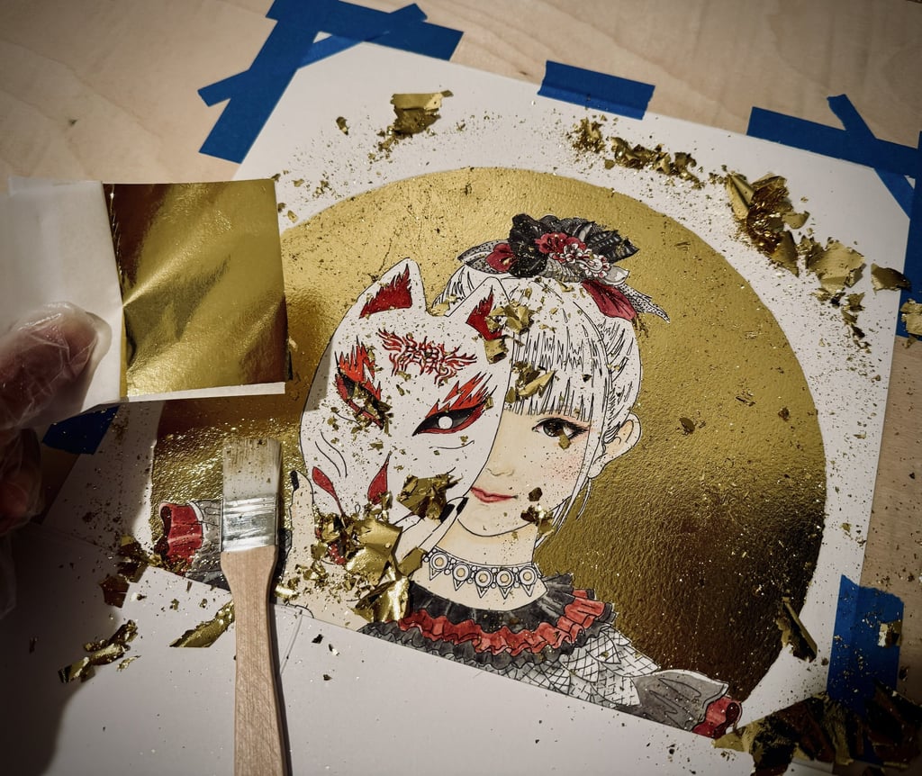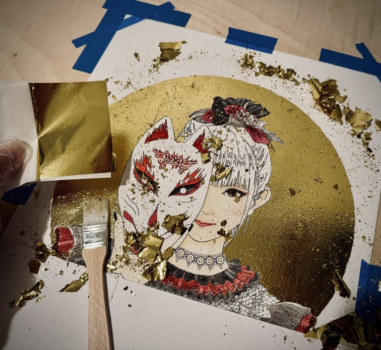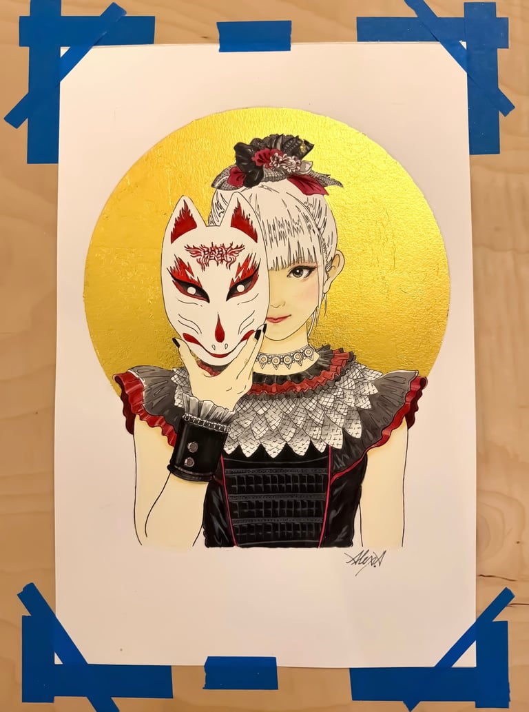 I thought Su-Metal, with her famous 'kitsune' fox mask, would be a great subject for my weekend drawing. I wanted to focus on the details while using a simplified drawing style that mimics old Japanese artwork, with gold foil in the background. I tried to create an image of her strong presence, the sharp lines of her silhouette, the power in her eyes, and the unique look of the fox mask, all of which come together to create a striking image I wanted to capture.